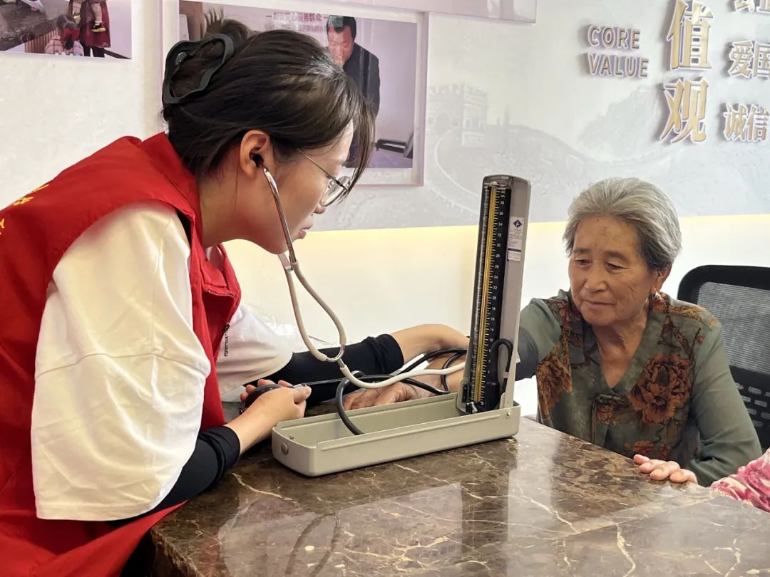 志愿者们在村委会工作人员的带领下,来到了岱庄村的临时检查站。为村民们提供测量血压、检测血糖、保健按摩等志愿服务。