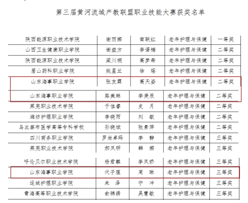 近日,第三届黄河流域产教联盟——老年护理与保健赛项在山西运城举行,学校金年会jinnianhuicom2023级智慧健康养老服务与管理专业路美琳(指导教师:李庚辰)、张友霖(指导教师:高天姿)、代子莲(指导教师:周琳)三名学生赢得比赛二等奖两项、三等奖一项。