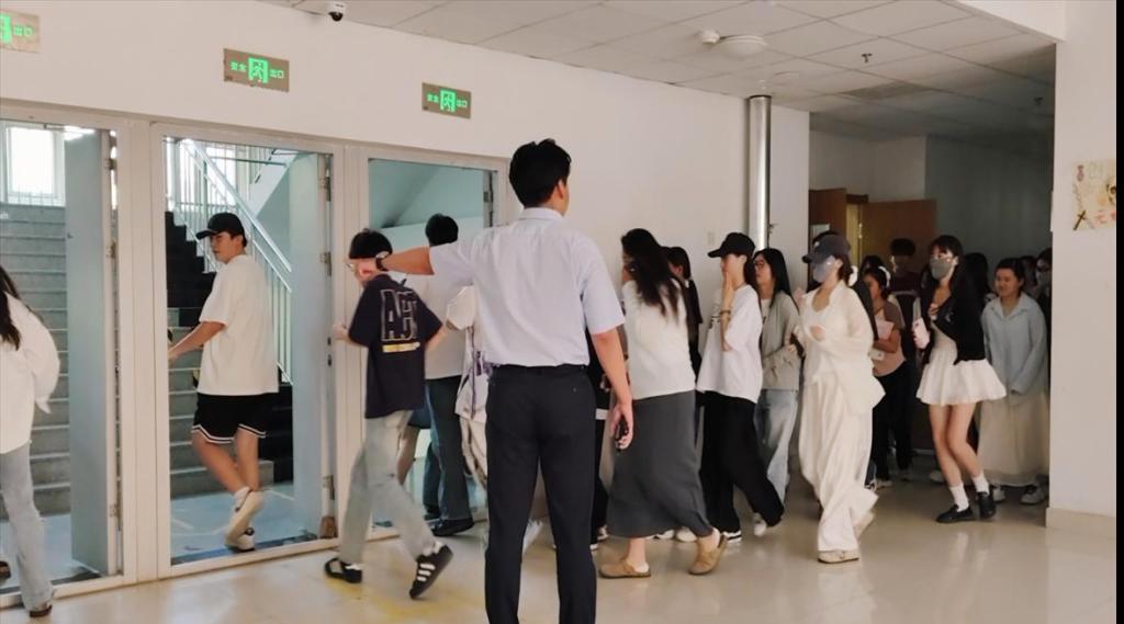 随着消防警报声骤然响起,演练正式拉开帷幕。23、24级学生按照预定的疏散路线,用湿毛巾捂住口鼻,弯腰低姿,迅速、有序地从教学楼各教室撤离。在学院教师和学生干部的引导下,24级新生疏散仅用时4分钟,有丰富经验的23级学生更是仅用1分52秒便安全、快速地疏散至指定区域。