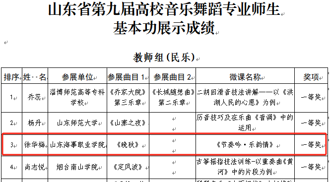近日,由山东省教育厅主办的山东省第九届高校音乐舞蹈专业师生基本功展示活动落下帷幕。金年会金年会jinnianhuicom教师徐华梅荣获教师组(民乐)一等奖。