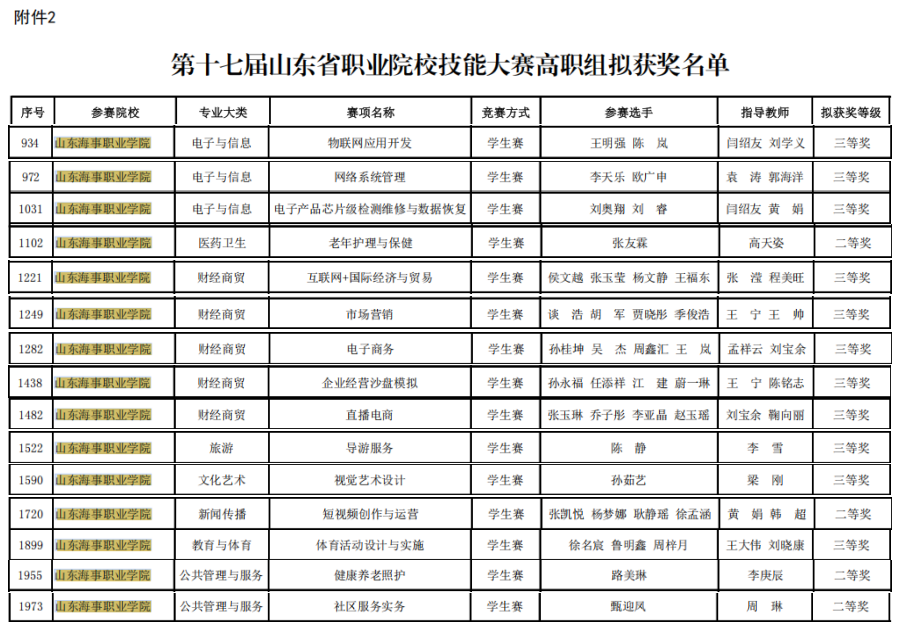 近日,山东省教育厅发布《关于第十七届山东省职业院校技能大赛拟获奖名单公示》,金年会上榜15项(二等奖4项,三等奖11项)。获奖数量创新高,实现大赛新突破。
