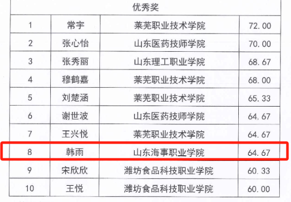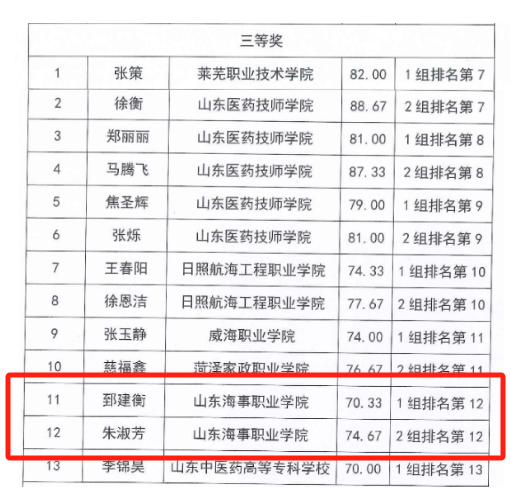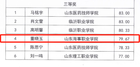 此次比赛,郅建衡(指导教师:刘杨梅)、朱淑芳(指导教师:周爽)分别荣获保健按摩师赛项学生组三等奖,司宗昊(指导教师:栾峻松)荣获保健按摩师赛项学生组优秀奖;董晓玉(指导教师:李梦媛)荣获保健调理师赛项学生组三等奖,韩雨(指导教师:刘杨梅)荣获保健调理师赛项学生组优秀奖。
